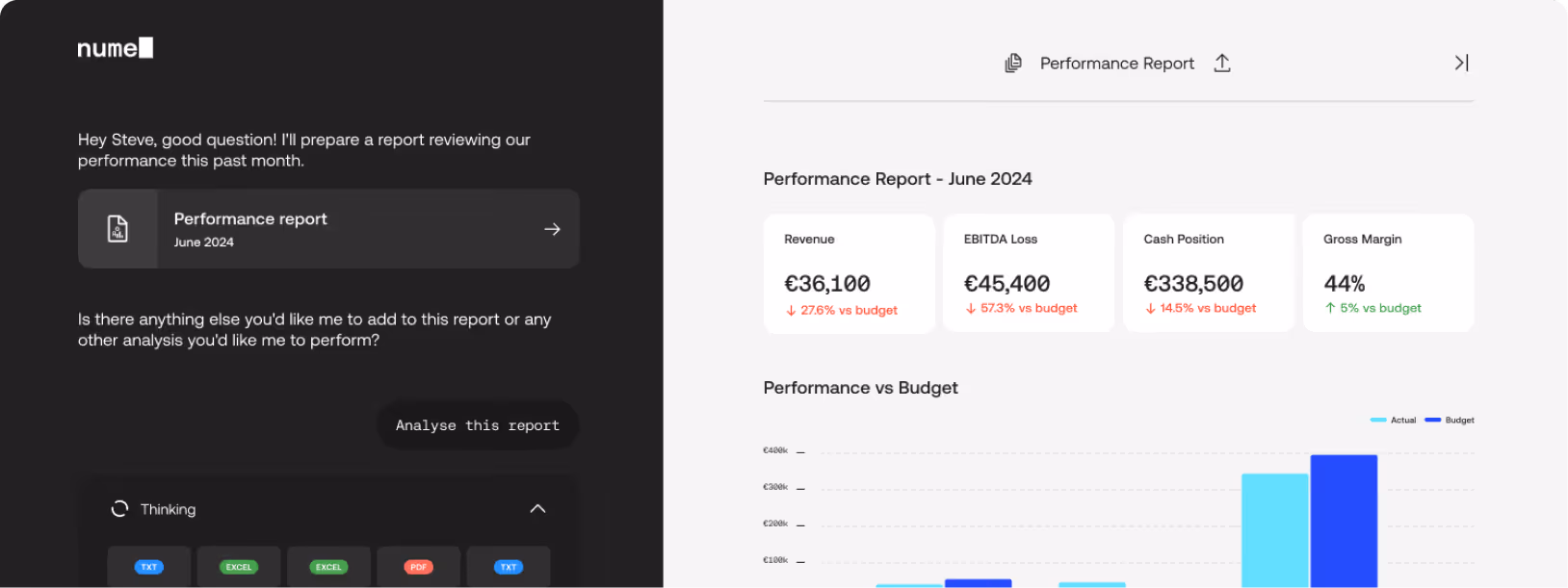 Skip the spreadsheets and stop waiting for your bookkeeper. Nume gives you instant access to the financial insights you need, analyzing your business data in real-time. Ask about cash flow trends, expense patterns, or growth opportunities and get immediate, actionable answers.